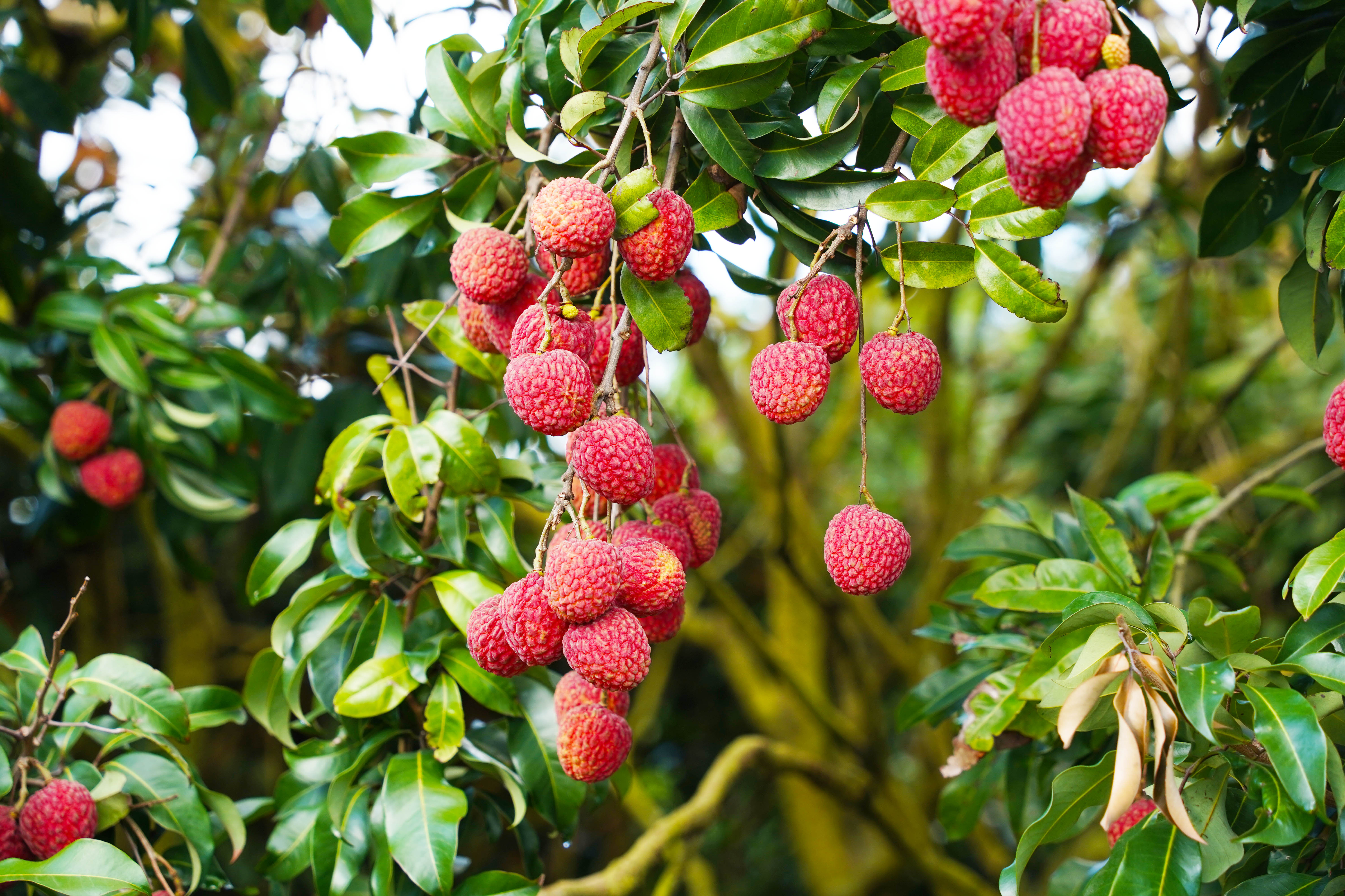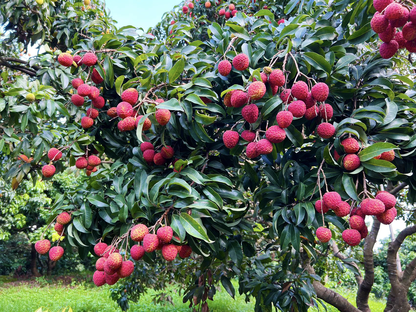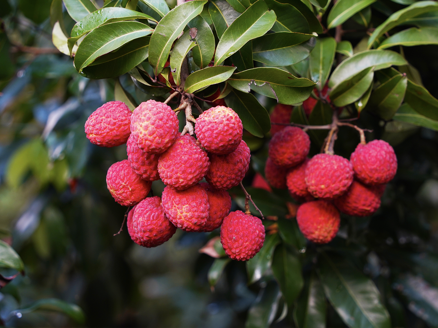 颗颗鲜红鼓胀的荔枝挂满枝端